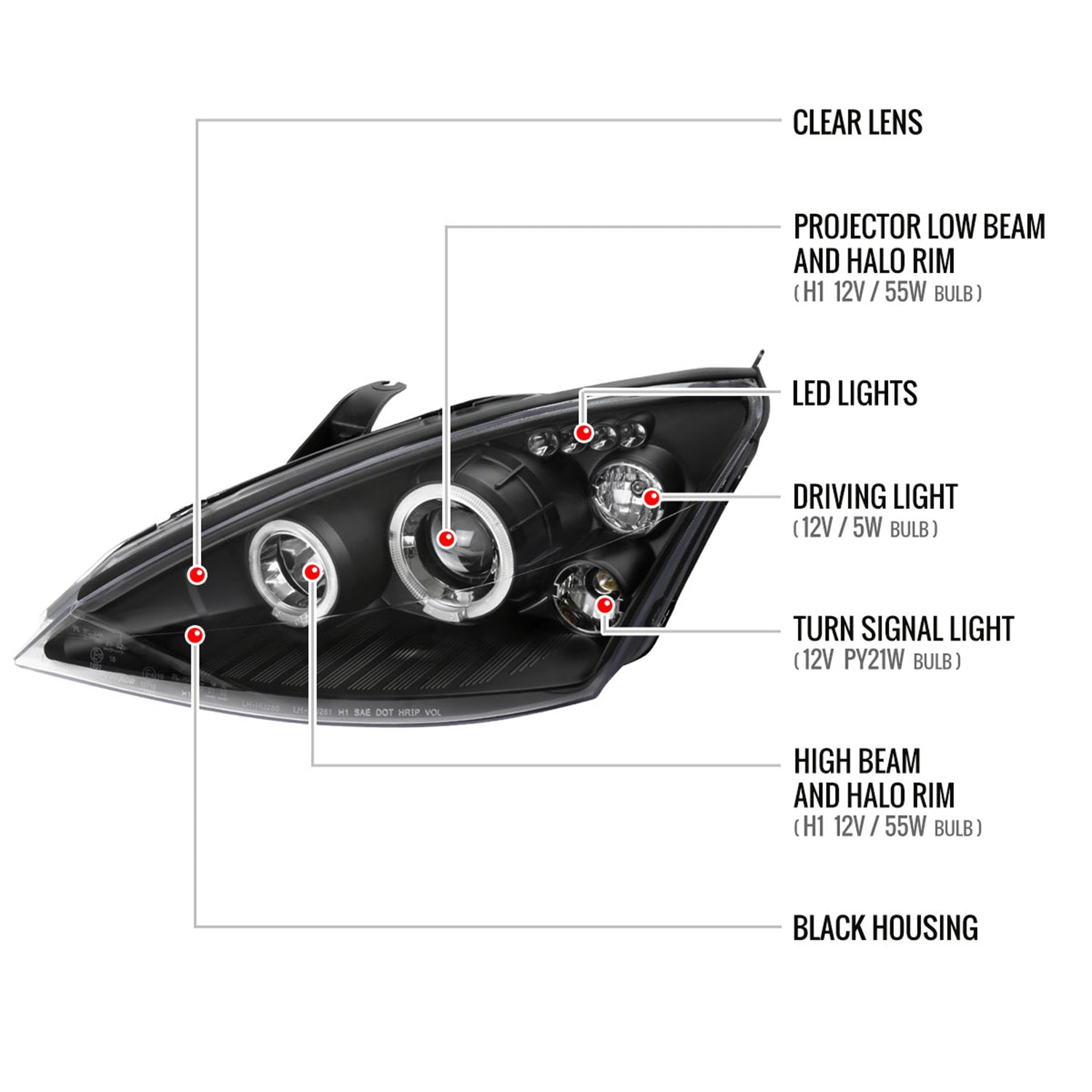 2000-2004 Ford Focus Dual Halo Projector Headlights Matte Black/Clear Lens