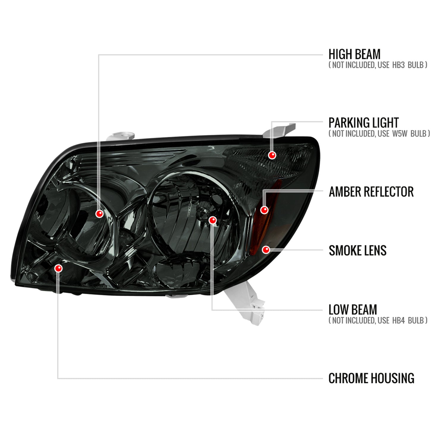 Upgrade your 2003–2005 Toyota 4Runner’s visibility and style with these factory-style headlights featuring a chrome housing and smoke lens. Enjoy safer nighttime driving and a refreshed look that stands out on daily commutes or weekend adventures.