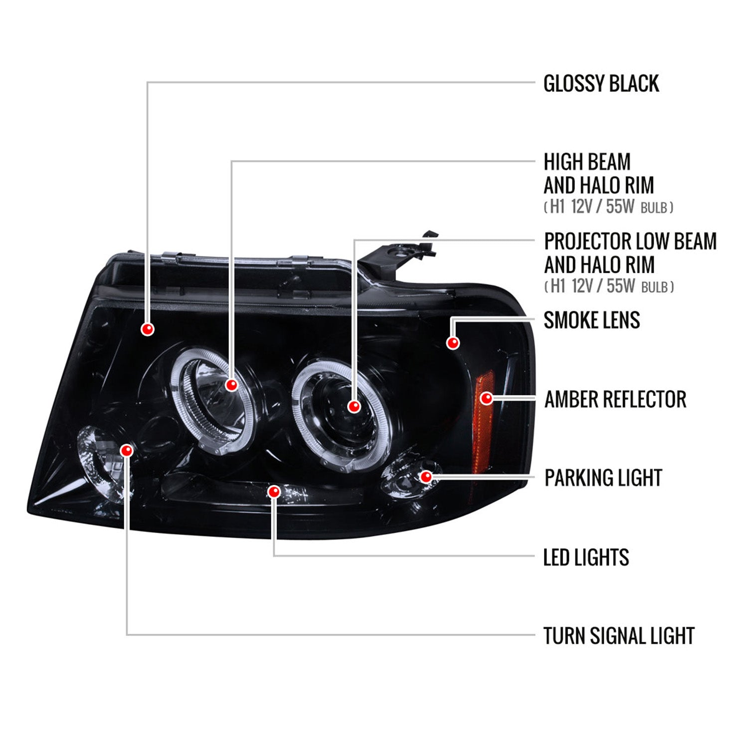 Upgrade your Ford F-150 or Lincoln Mark LT’s nighttime visibility and style with dual halo headlights in a smoke finish. These headlight assemblies help you see better on dark roads and give your truck a modern, custom look that stands out in daily traffic.