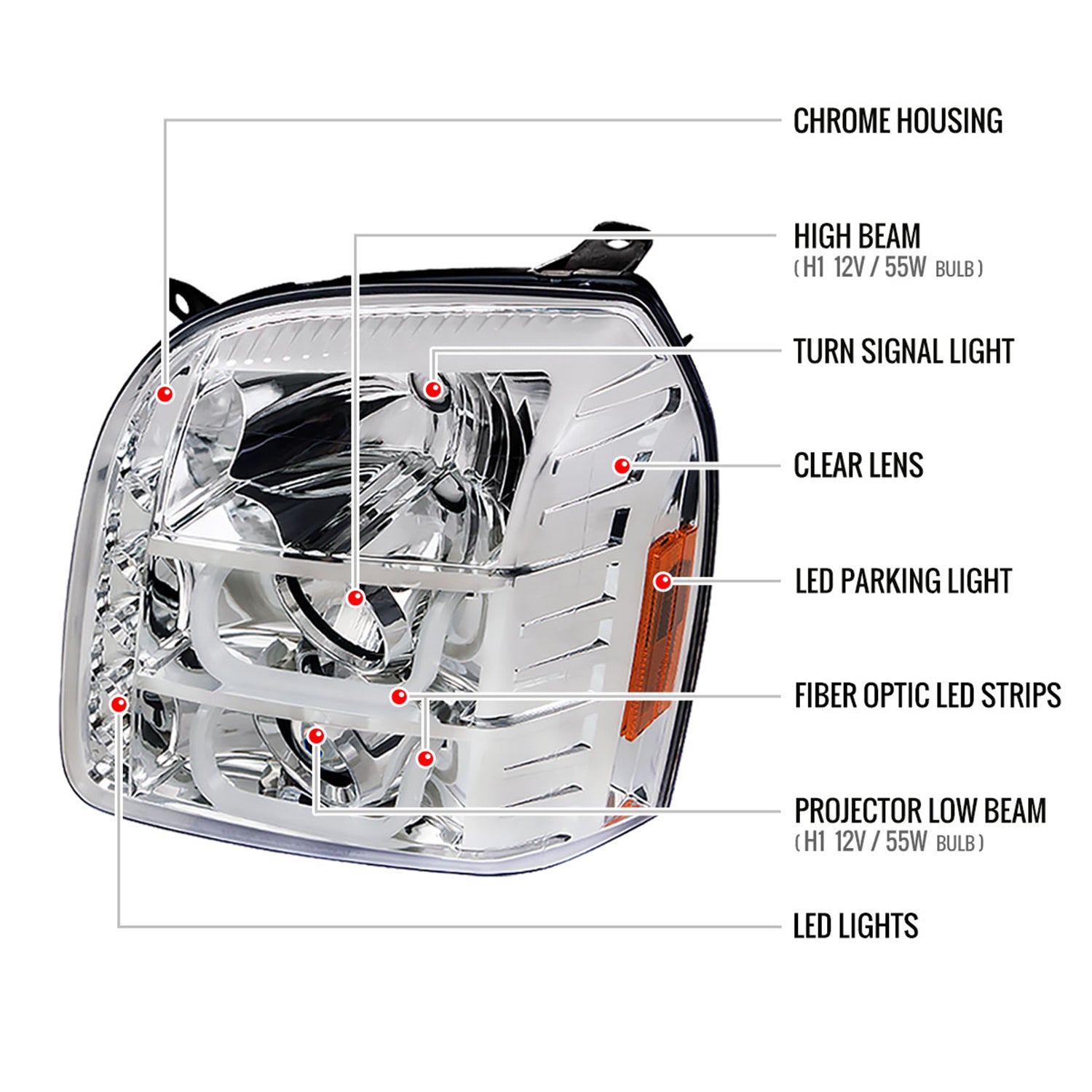2007-2014 GMC Yukon/Yukon XL 1500/2500 LED U-Bar Projector Headlights Chrome