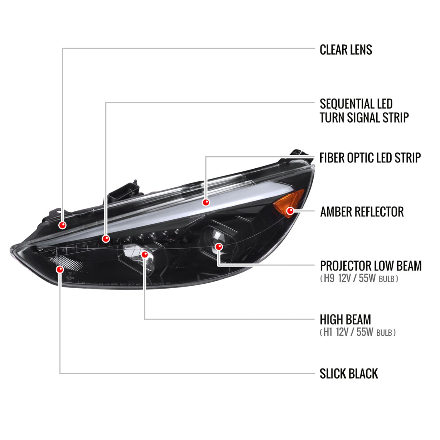 2015-2018 Ford Focus LED Signal Projector Headlights Jet Black/Clear